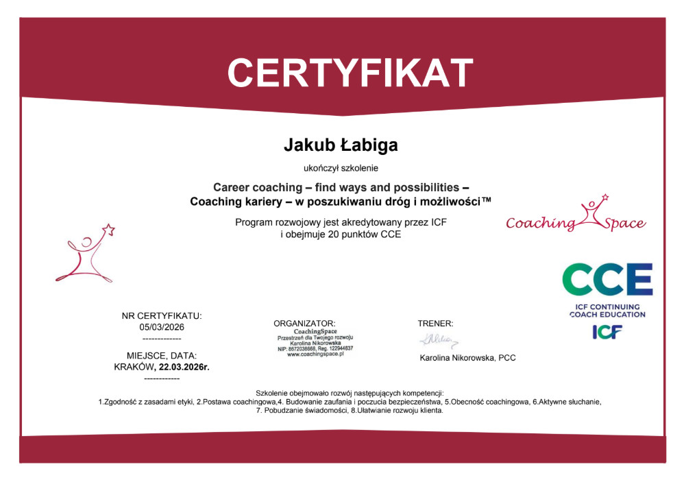 Łącznie mam ponad 220 godzin doświadczenia w pracy coachingowej i doradczej. Łączę wiedzę psychologiczną z doradztwem zawodowym oraz pasją do wspierania ludzi w osiąganiu satysfakcji zawodowej.
