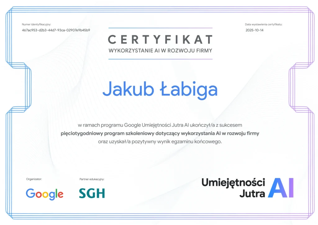 Certyfikat – Pięciotygodniowy program szkoleniowy dotyczący wykorzystania AI w rozwoju firmy i produktów od Google, SGH
